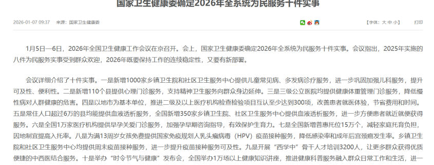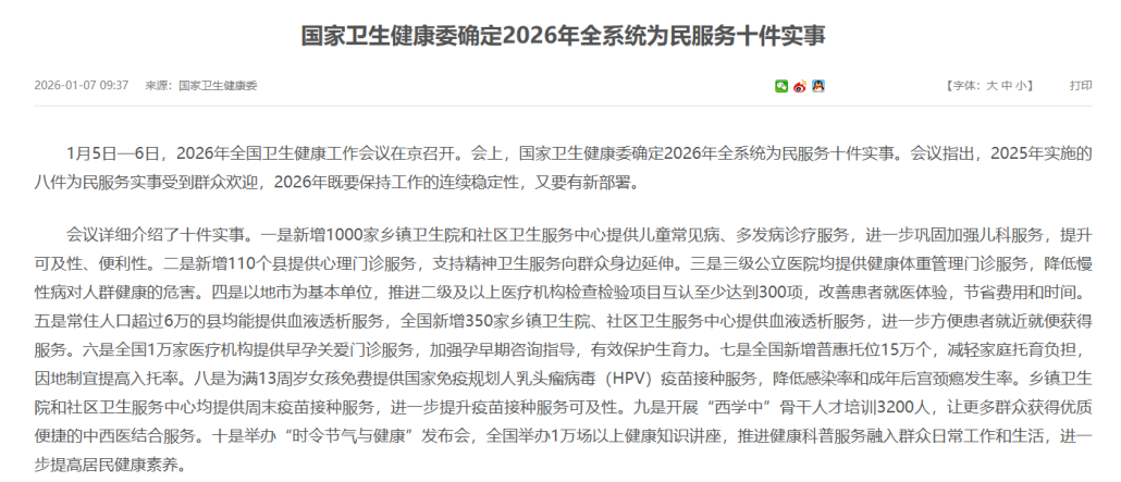 1月5日至6日,全国卫生健康工作会议在北京召开。会上,国家卫健委正式发布了“2026年全系统为民服务十件实事”。