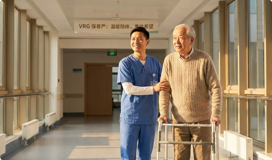 下半场是VRG(康复期): 这好比是赛车的“性能调校”。它的目标是**“保尊严”**。 什么叫尊严? 对于一个中风患者,尊严不是更昂贵的进口药,而是拔掉尿管自己上厕所; 对于一个骨折老人,尊严不是多住几天院,而是能重新以此为起点,走回公园下棋。
