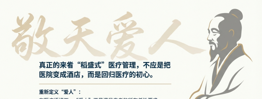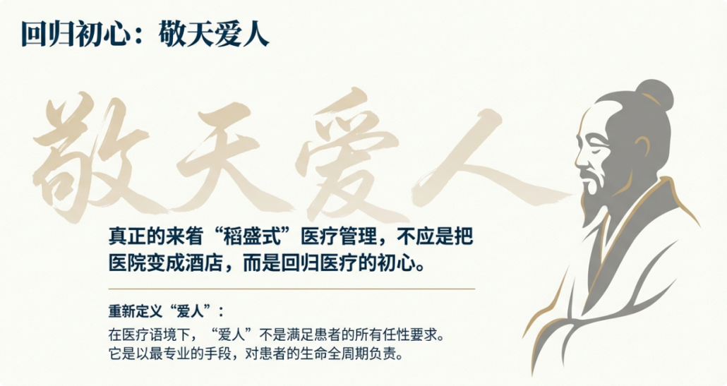 如果医院只学到了日式服务的“形”——让护士学会了蹲跪,让医生学会了话术,却缺乏内在的价值支撑,那么这只是一场拙劣的模仿秀。真正的“稻盛式”医疗管理,不应是把医院变成酒店,而是回归医疗的初心:敬天爱人。 在医疗语境下,“爱人”不是满足患者的所有任性要求,而是以最专业的手段,对患者的生命全周期负责。