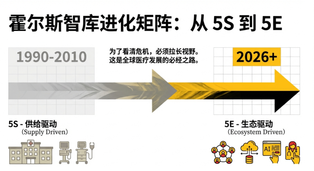 为了看清这场危机,我们需要把视野拉长。霍尔斯智库根据全球医疗发展史,构建了一个“5S-5C-5E进化矩阵” 。