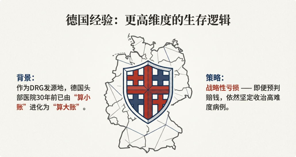 - 德国经验: 对于代表学科高地、手术难度大的疑难病例,即便预判在支付标准下会产生亏损,德国的头部医院依然会坚定地收治。他们将这笔亏损视为“购买学科高地的广告费”,是建立核心竞争力的必要投资 。