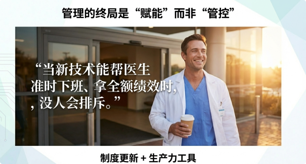 当医生发现,医院引入的新技术不是为了考核他们,而是每天能帮他们准时下班、并且拿到全额绩效时,他们还会排斥吗?
