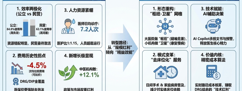 - 打赢效率周转攻坚战: 公立医院要在 8.0 天平均住院日的基础上,利用日间手术和加速康复进一步提速。而民营医院应主动放弃与公立医院在大型设备上的军备竞赛,转攻长期护理与特色中医,填补 37% 的床位闲置缺口。