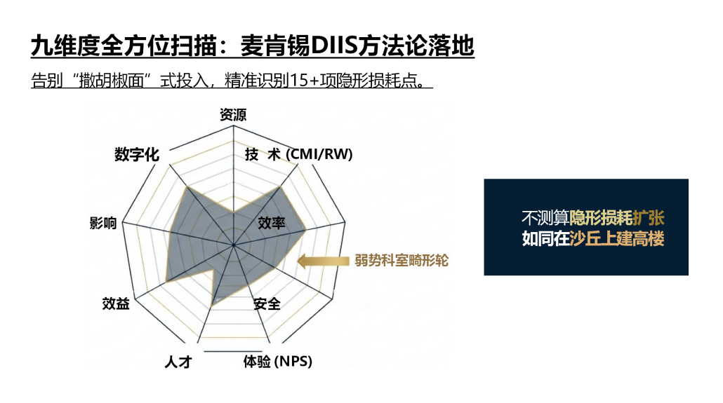 Phase 1:全维穿透,精准排雷(第1个月) 应用DIIS理论的Data与Information层,对医院(或目标科室)进行9大核心KPI(资源、技术、效率、安全、体验、人才、效益、影响、数字化)的雷达扫描。找出导致公立医院国考失分、民营医院利润流失的管理砂眼,出具《战略位势与隐形损耗诊断白皮书》。