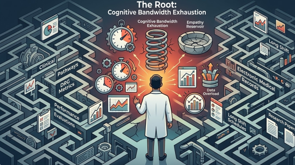 2. 组织高压下的认知耗竭 在极高门诊流转率和复杂手术压力的交织下,医护人员的“认知带宽”被严重透支。共情是一项极度消耗心智资源的“情绪劳动”。当系统没有为医护人员提供足够的心理冗余时,他们在面对患者的疑问时,会本能地采取防御性、指令性的沟通策略以节省认知资源。这不是冷漠,而是组织疲劳的应激反应。