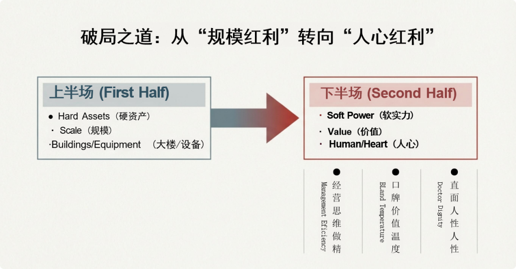 在当前的医保改革背景下,民营医院正经历前所未有的医疗寒冬,此时,人文温暖就成为了不可替代的破局星火。然而,站在时代交汇点预测医疗的未来,当人工智能与冰冷的医疗设备逐渐填平技术鸿沟时,医疗的核心竞争力必将不可逆转地向着“情绪价值”与“人性关怀”转移。寒冬并非行业终结,而是淘汰平庸的开局;在冰冷的机器面前,唯有人文温暖是不可替代的星火。