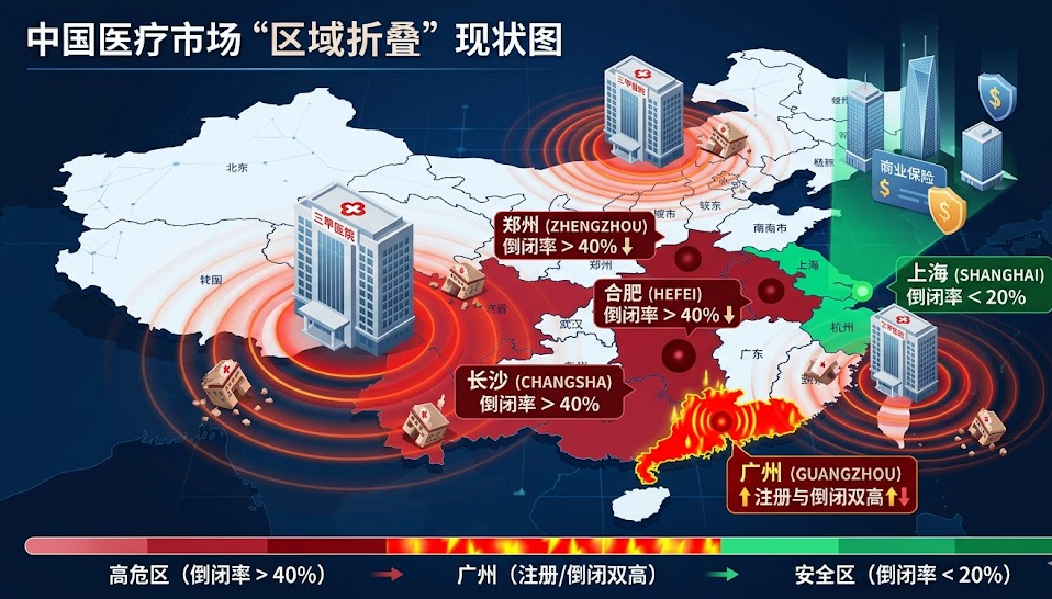 - 院长启示: 郑州、合肥等地的超高倒闭率,往往伴随着当地拥有“超级三甲医院”(如宇宙第一大院),大医院的虹吸让周边小机构寸草不生。而上海的低倒闭率,得益于当地极度成熟的商业健康险体系和庞大的高端支付人群,支撑了多元化的高价值医疗服务。