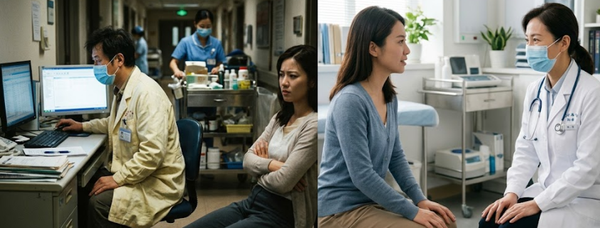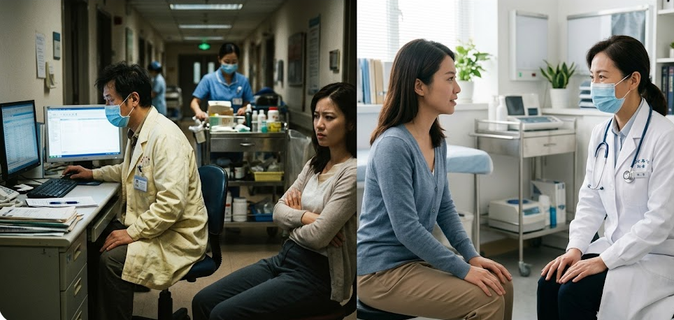 一位带着防备心和审视心态的患者走进诊室。接诊的医生确实有着二十年的丰富临床经验,但他的白大褂洗得有些发黄且皱巴巴的;问诊时,医生的眼神要么盯着电脑屏幕,要么飘忽不定;旁边的护士推着治疗车走进来,“哐当哐当”声音巨大,拿起病历本随意翻得哗哗作响。